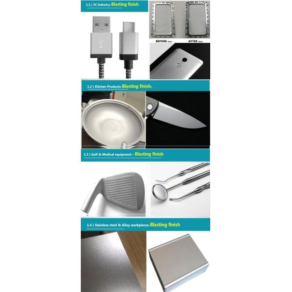Widely applicable for metal meterials like alu, alu alloy, stainless steel. copper, etc. It can get different matt metal surface effect by choosing different sizes of ceramic beads.